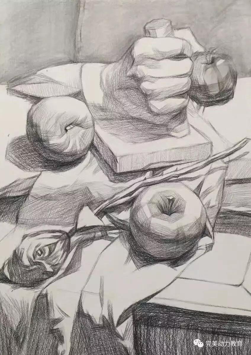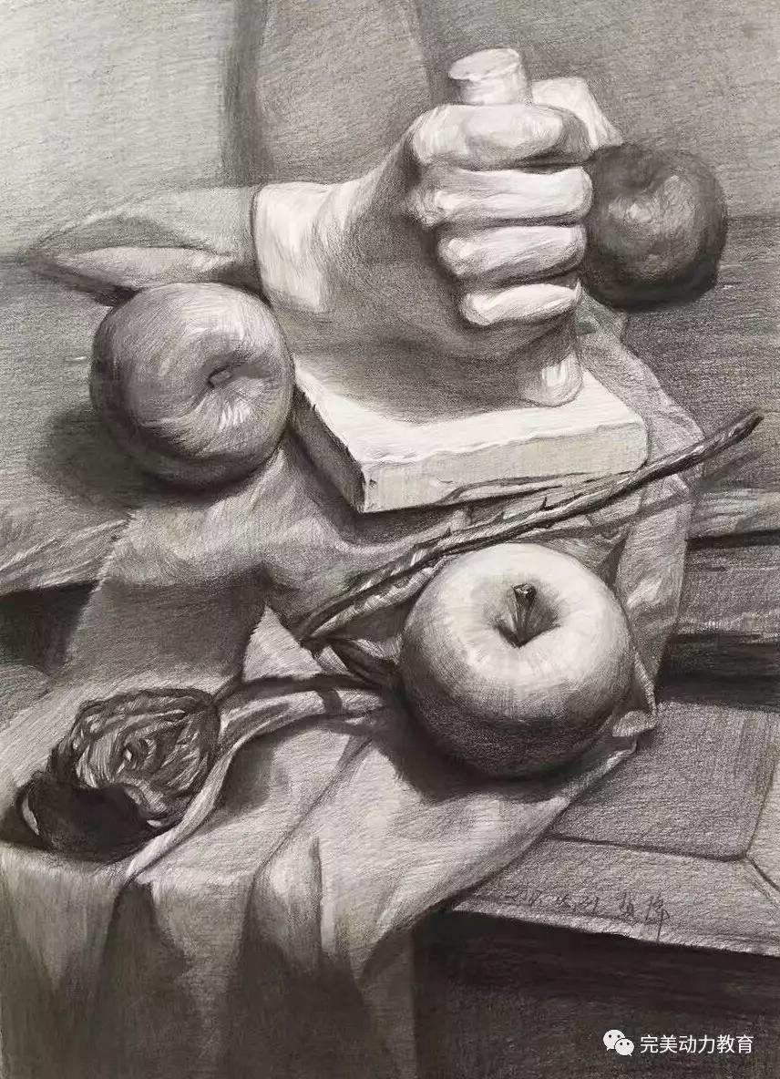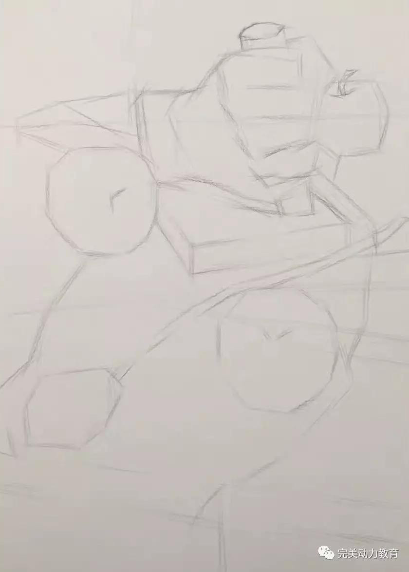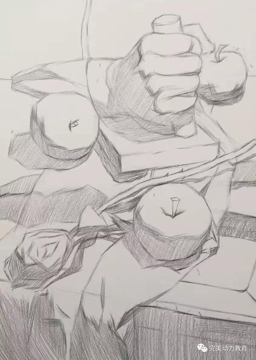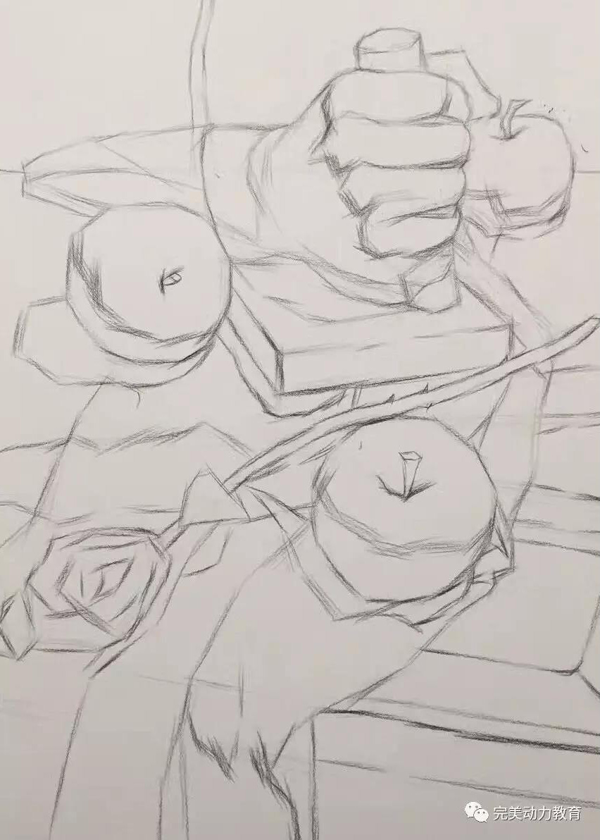 將物體的形態(tài)具體化,這個時候可以用稍微軟一點的鉛筆,勾勒出所有物體形態(tài),注意線條的輕重變化、物體之間的距離把控和主體物的重點描寫。利用桌面的透視原理延伸整幅畫面的空間感。