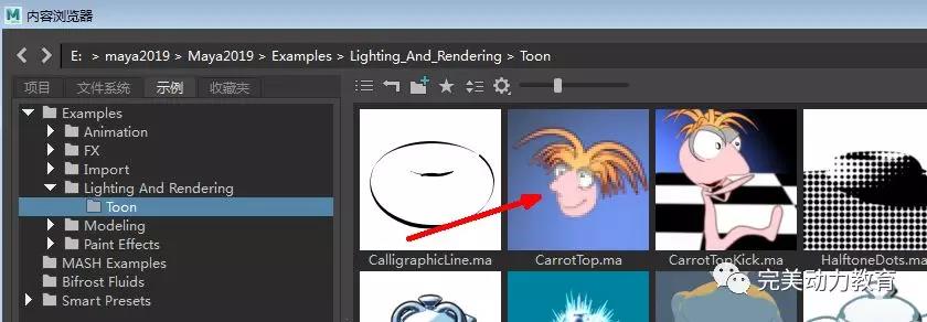 雙擊打開(kāi)MAYA自帶的案例,選擇箭頭指定的這張就OK啦