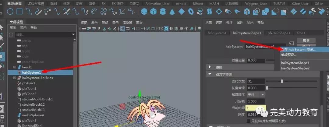 之后在大綱里選中hairSystem1命名保存預(yù)設(shè),新建場(chǎng)景,按照箭頭指示來(lái)操作哦