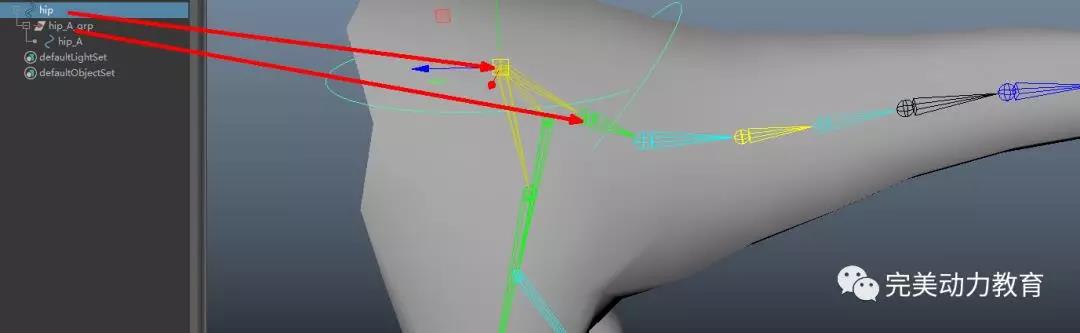 添加兩個(gè)控制器hip、hip_a(需要打組并命名為hip_a_grp),分別吸附到根骨骼和根骨骼下的第一節(jié)骨骼(選中組hip_a_grp吸附),且把組hip_a_grp作為hip的子層級(jí)。