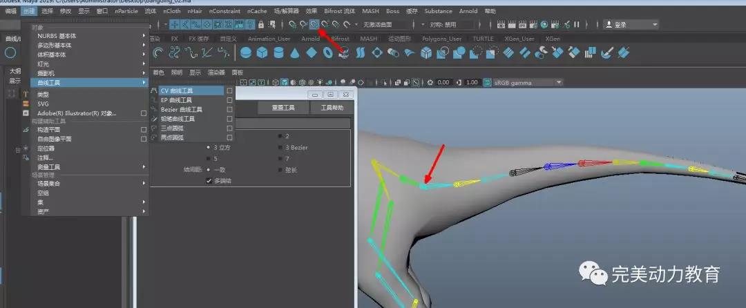 打開(kāi)曲線工具(設(shè)置如下圖所示),打開(kāi)點(diǎn)吸附以下圖箭頭指向的關(guān)節(jié)球開(kāi)始往后創(chuàng)建一條CV曲線。