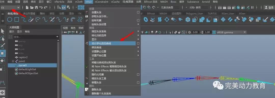 之后就是在FX模塊下,選擇剛創(chuàng)建好的CV曲線執(zhí)行nhair菜單下的動(dòng)力學(xué)花選定曲線
