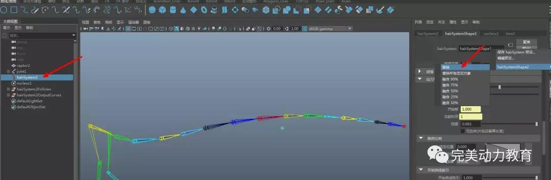 大綱選中hairSystem2 ctrl+a在屬性編輯器里點(diǎn)擊預(yù)設(shè)選中我們一開(kāi)始保存的預(yù)設(shè)選擇替換