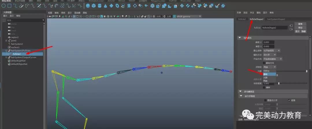 大綱選中組hairSystem2Follicles下的follicle2,在屬性編輯器里找到第二項(xiàng)follicleshape2,將毛囊屬性下的點(diǎn)鎖定改為基礎(chǔ)