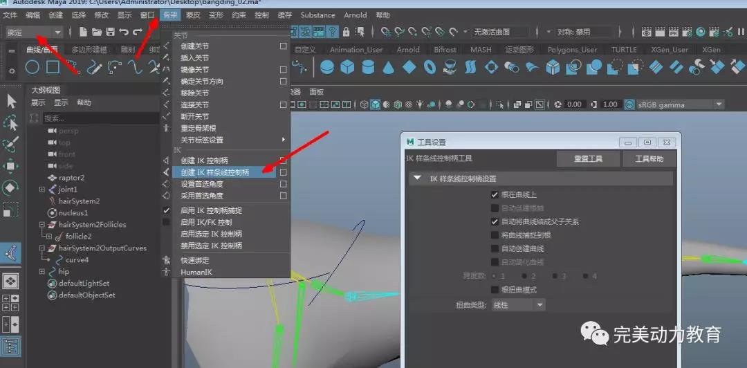 在綁定模塊下,為骨骼創(chuàng)建IK樣條線控制柄(工具設(shè)置如下圖所示)