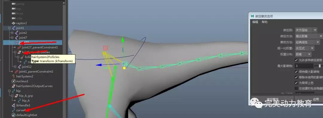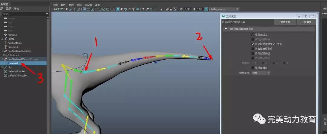先選擇根骨骼下第二節(jié)再選擇最尾部的骨骼球,然后在大綱里按CTRL加選組hairSystem2OutputCurves下的CV曲線curve4,也就是創(chuàng)建頭發(fā)自己生成的那條曲線(先后順序看序號(hào)咯)