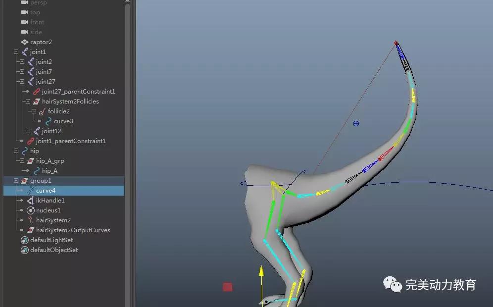 把組hairSystem2Follicles作為根骨骼下第一個(gè)關(guān)節(jié)球的子層級(jí),再把曲線curve4從組里解放出來(lái)