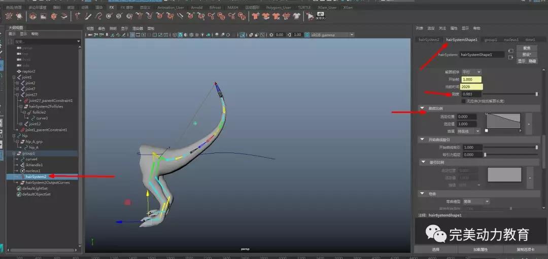 最后整理一下大綱,把剛才的那些節(jié)點(diǎn)(curve4、ikHandle1、hairSystem2OutputCurves、nucleus1、hairSystem2)打組,像這樣↓