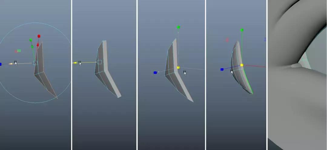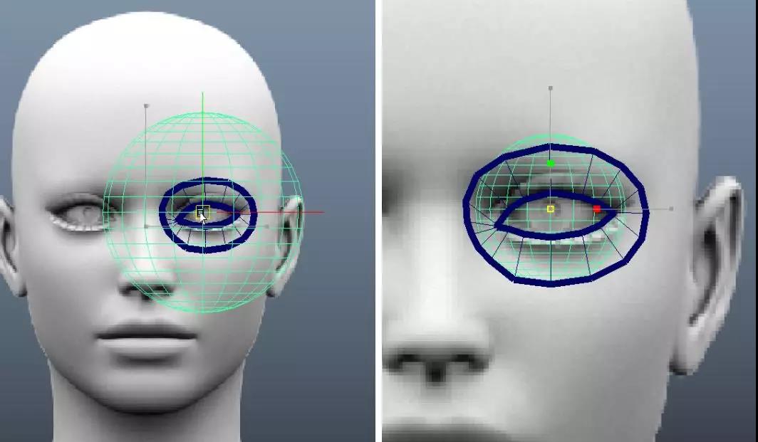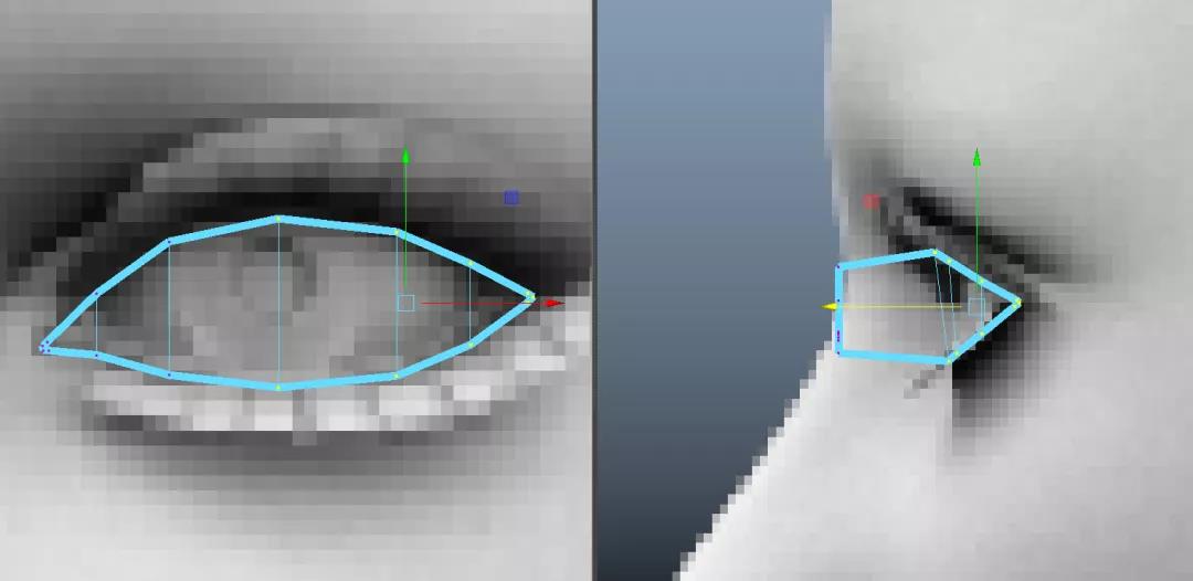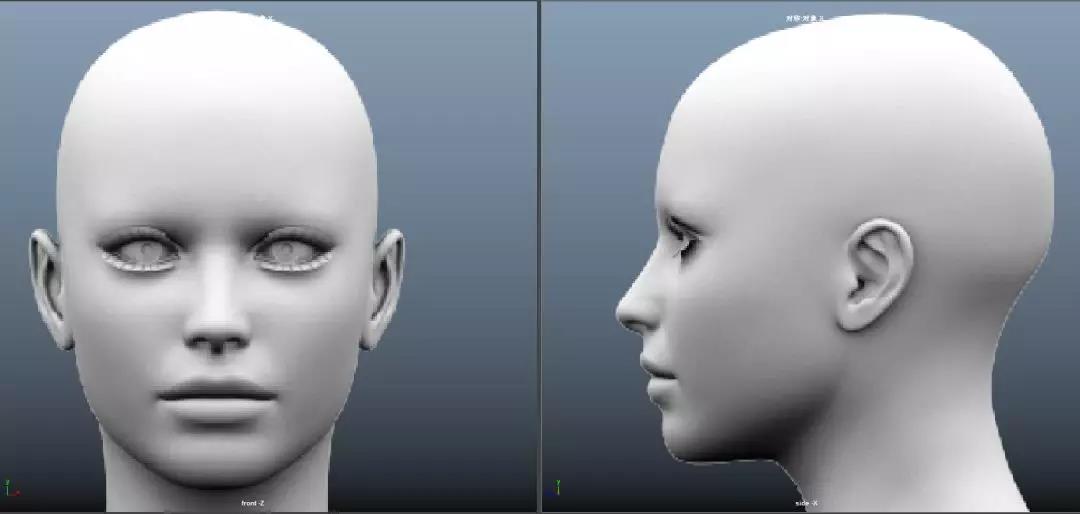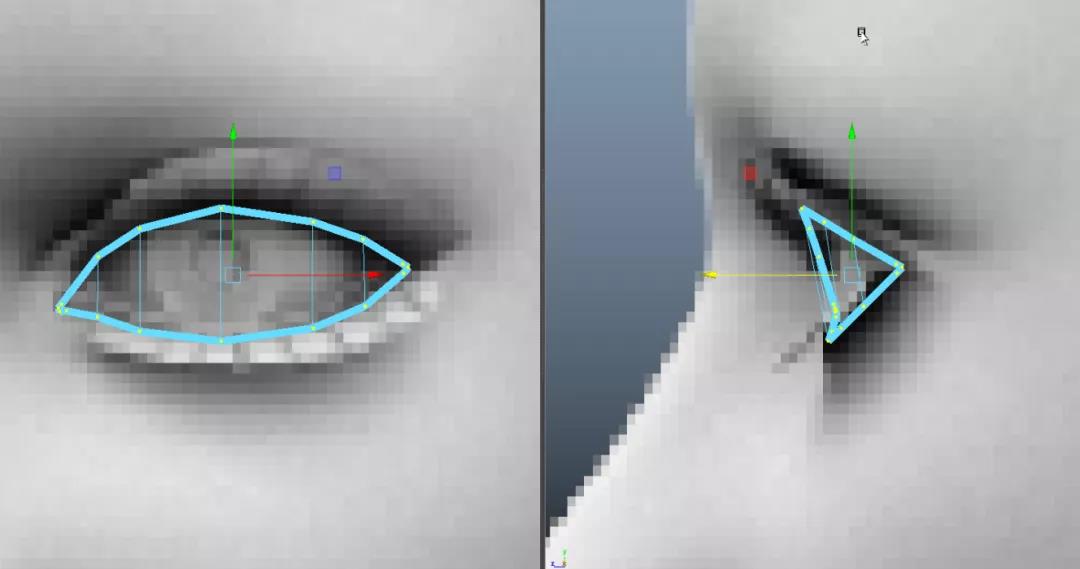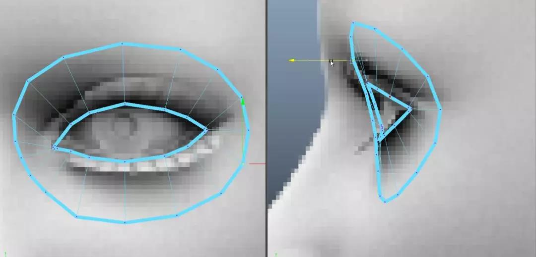 1、參考前視圖和側(cè)視圖進(jìn)行眼睛部位的制作:如下圖