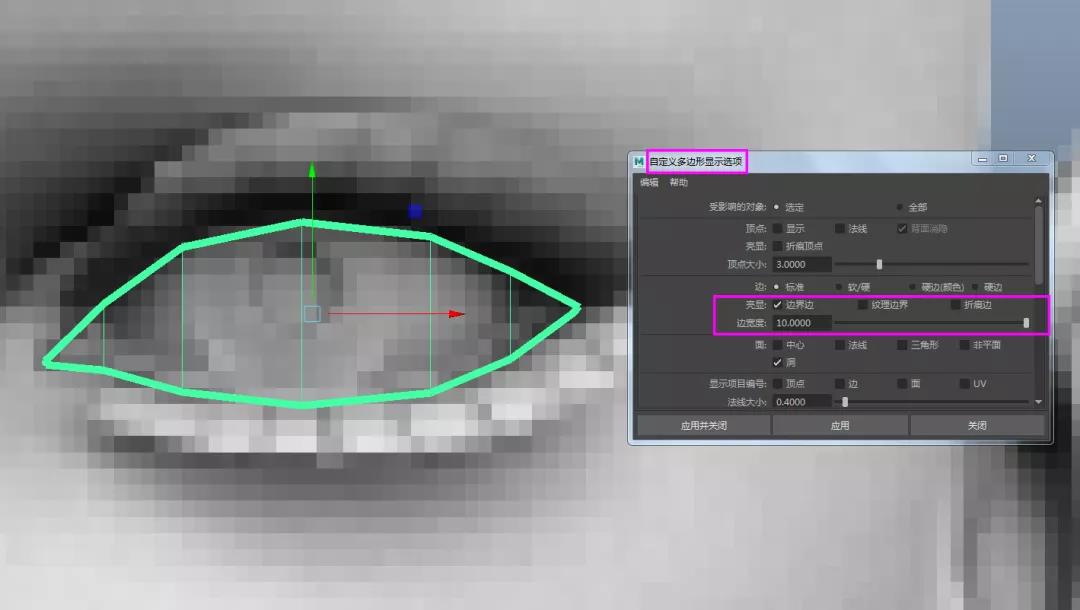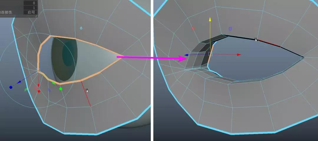 8、選擇“眼皮”外邊緣的邊施加“擠出邊”工具:如下圖
