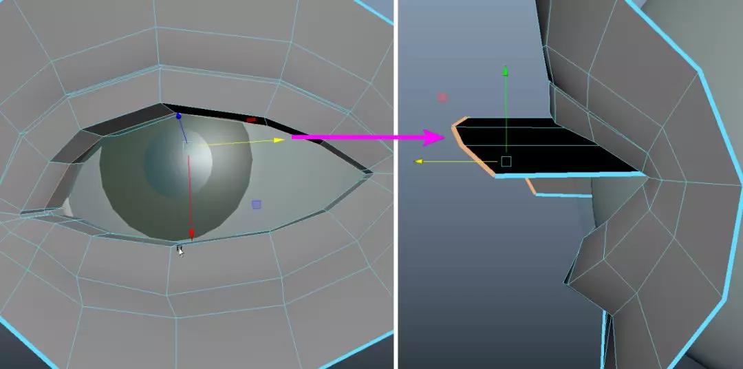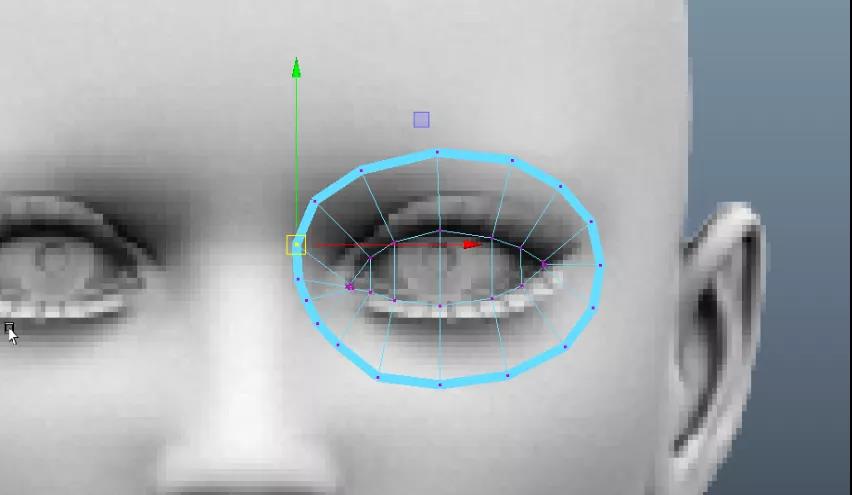32、選擇瞼緣內(nèi)側(cè)部位的環(huán)線進(jìn)行“擠出邊”以制作睫毛面片:如下圖