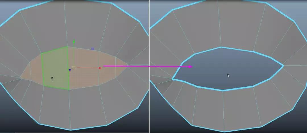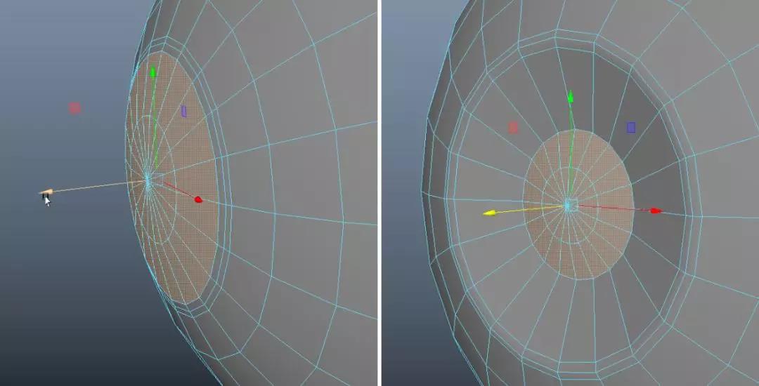 18、選擇“虹膜區(qū)域”的面進(jìn)行“擠出”并移動(dòng)、縮放得到“瞳孔”:如下圖