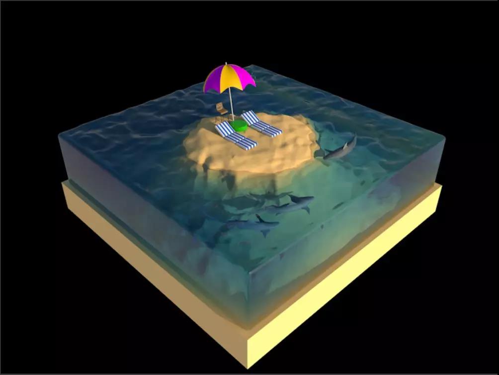 如下圖中的小島案例,我們希望給海面一個波動的動畫,同時在海面高低起伏時,岸邊的沙灘相應地產(chǎn)生變色的效果,這要怎么實現(xiàn)呢?