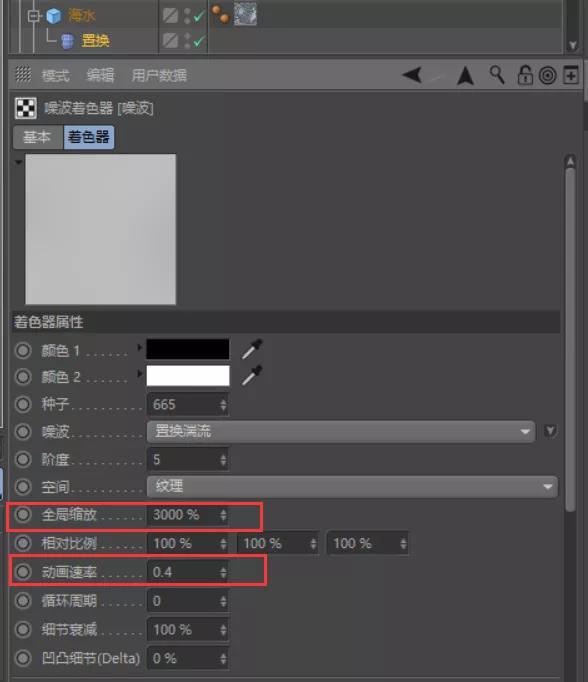 然后使用置換變形器,在其“著色”屬性下,添加一個噪波,噪波的全局縮放改為3000%。把動畫速率改為0.4。再到置換的對象屬性下,把高度改為100cm。這樣播放的時候海水就會動起來了。