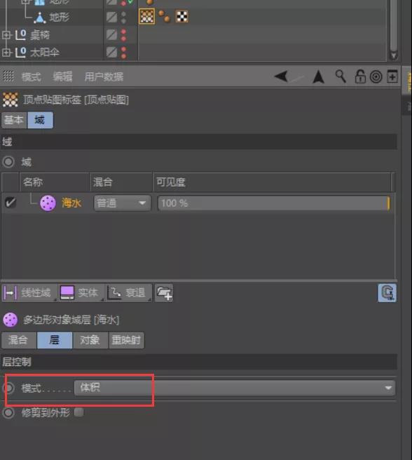 然后把海水拖進這個域的區(qū)域內,我們需要使用海水來控制這個海水打濕地面的效果。拖進來之后,在下面把海水的模式改為“體積”,這和老版本的體積效果器是比較相似的。這樣一來,隨著海水的高低起伏,頂點貼圖也會相應地變化啦。