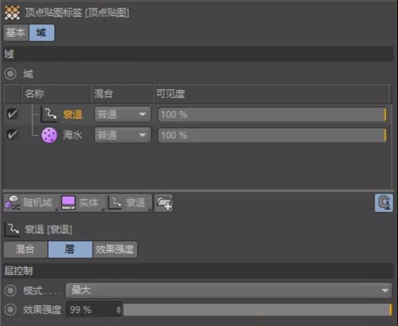 我們都知道,海水打濕地面的效果,并不會因為海水的退去馬上消失,而是逐漸消退,所以我們給海水這個體積域上面疊加一個衰退效果。選擇域下面第三個灰色的按鈕,找到衰退,然后把強度調大,這樣海水產(chǎn)生的效果會慢慢退去。