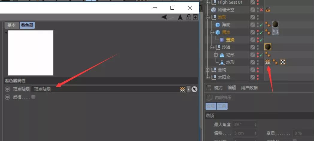 在中間的蒙板通道里,我們新建一個“效果”里的“頂點貼圖”,然后點擊頂點貼圖,把我們剛制作的帶有動畫的頂點貼圖標簽拖進相應的目標框里去。