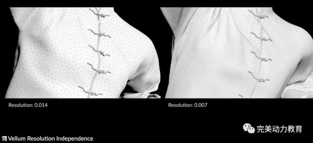 我們都知道,解算布料效果跟布料模型的布線有很大關(guān)系,比如時(shí)常碰到模型布線有問題或是精度不夠。而這次的Vellum更新,讓解算精度與模型布線脫離,也就是這個(gè)“Resolution Independence”,不管模型布線是啥樣的,解算精度是想加多少就有多少~