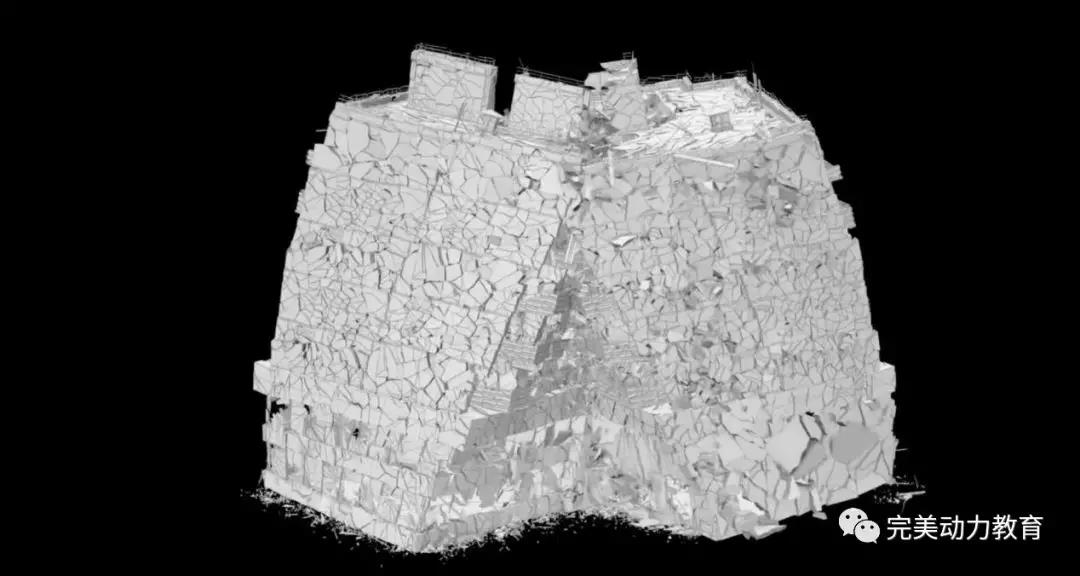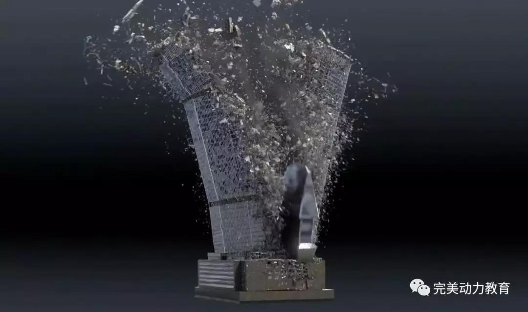 注意看這個(gè)大樓劈成兩半的截圖里面的橙色方框,看似這一攤碎塊毫不相干,但其實(shí)這個(gè)過程是被橙色方框整體被劈開的運(yùn)動(dòng)引導(dǎo)。