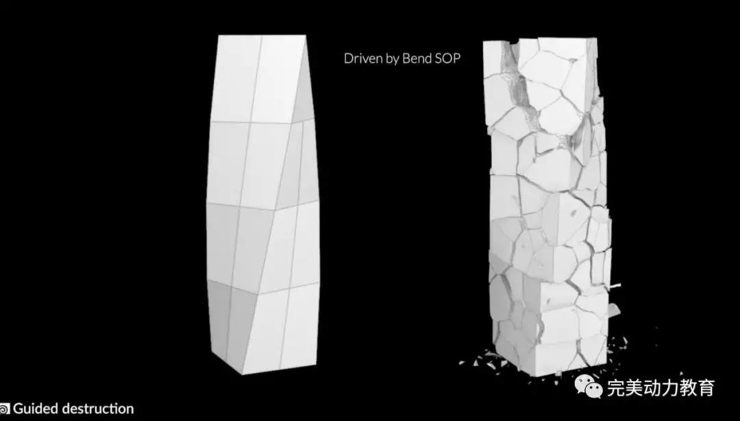而下面這張圖的剛體破碎是被SOP中的bend運(yùn)動(dòng)引導(dǎo),也就是說,你只需要先模擬出左圖中的運(yùn)動(dòng)(可以是SOP變形,可以是FEM解算后,亦或是外部動(dòng)畫導(dǎo)入),就可以用左圖的運(yùn)動(dòng)去驅(qū)動(dòng)破碎,讓剛體自熱而然的在這種形變中產(chǎn)生真實(shí)的碎裂!
