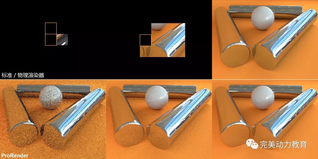上面的一行是標(biāo)準(zhǔn) / 物理渲染器的渲染過程,它需要分區(qū)塊計(jì)算圖像,因此開始時(shí)只能看到一下小部分的效果。