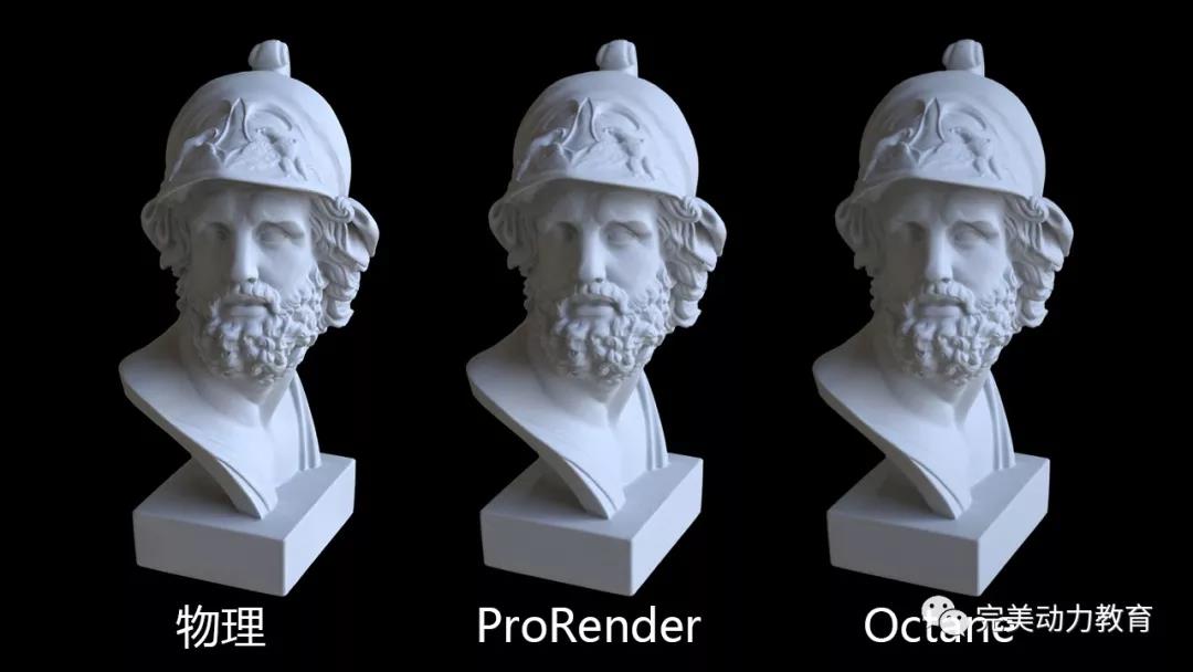 從左到右分別是:物理渲染器(開啟全局光照效果)、ProRender渲染器、Octane渲染器,使用同樣的HDRI圖像進(jìn)行照明。