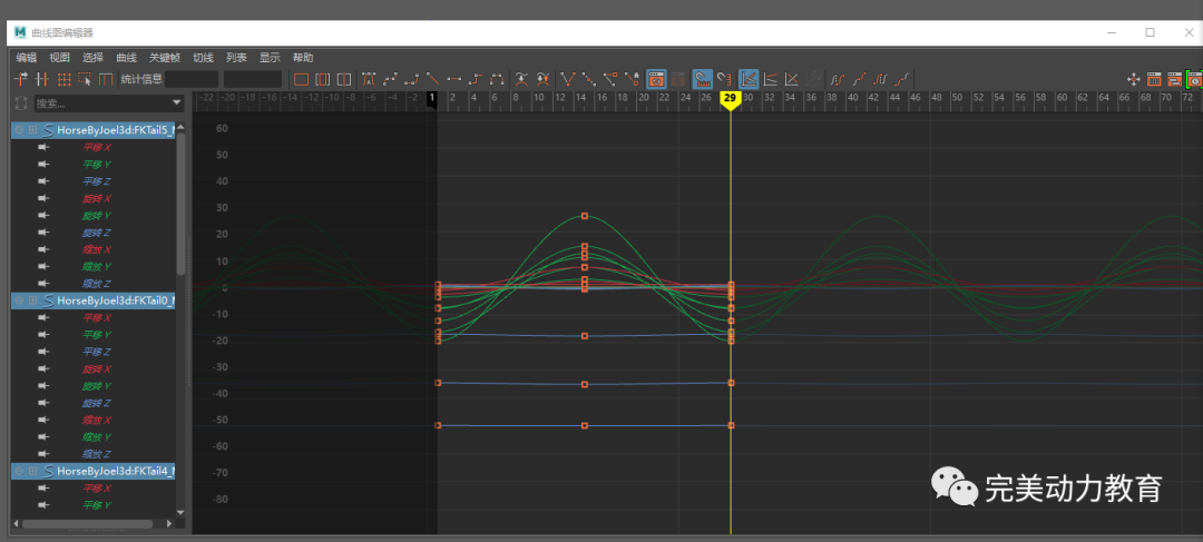 把第1幀的動(dòng)畫復(fù)制到第29幀,讓第1幀和第29幀動(dòng)作一樣,這樣我們好做循環(huán),選中選中所有的曲線在曲線編輯器里 點(diǎn)擊→曲線→前方無限→循環(huán)和曲線→后方無限→循環(huán)。