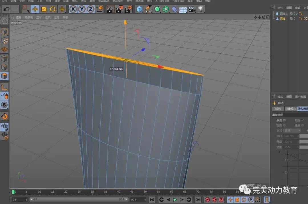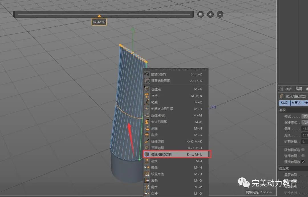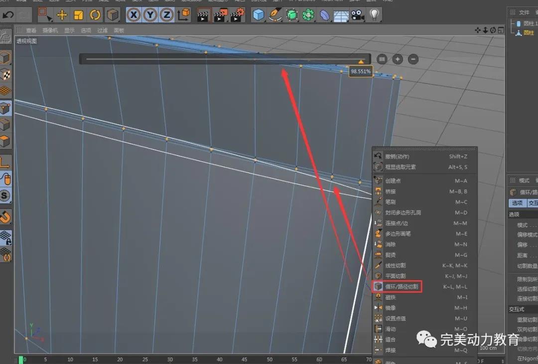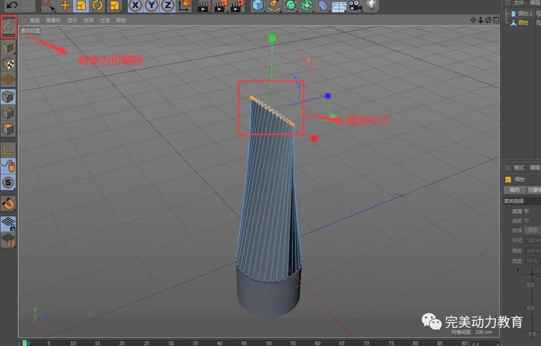 (2)將圓柱轉(zhuǎn)化為可編輯對象,調(diào)整圓柱粗細(xì),右鍵循環(huán)切割加線