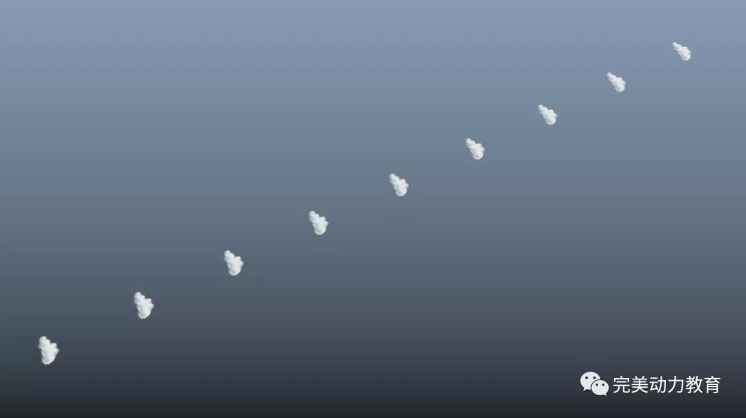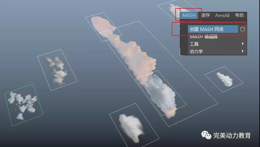 選擇所有云彩面片,創(chuàng)建Mash網(wǎng)格。完成后,云彩就會呈線性的排列。