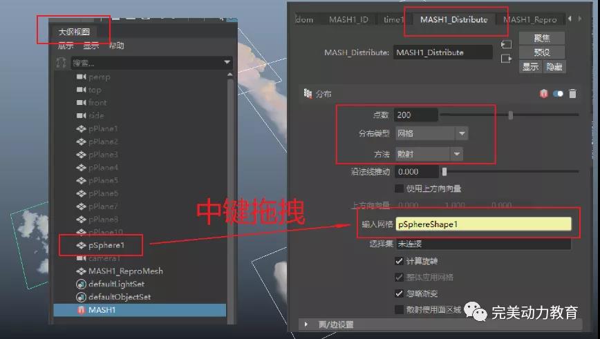 選擇Mash,在屬性欄中找到“Mash1_Distribute(網(wǎng)格分布)”。把點(diǎn)數(shù)改成200,“分布類型”改成“網(wǎng)格”;再用鼠標(biāo)中鍵,把剛才建好的天空球拖拽到Mash的“輸入網(wǎng)格”中。
