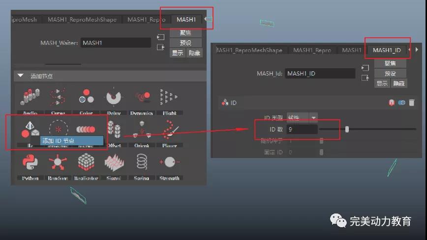 現(xiàn)在的云彩都是一樣的,只是因?yàn)槲覀儧]有指定Mash的數(shù)量。選擇Mash,給它添加一個“ID”節(jié)點(diǎn),同時把“ID數(shù)”調(diào)整為9。