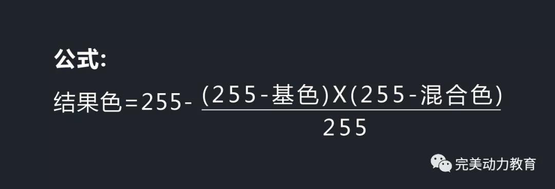 濾色,總的來說就是將整體畫面提亮,原理與正片疊底將整個畫面壓暗類似。濾色的公式如下圖所示: