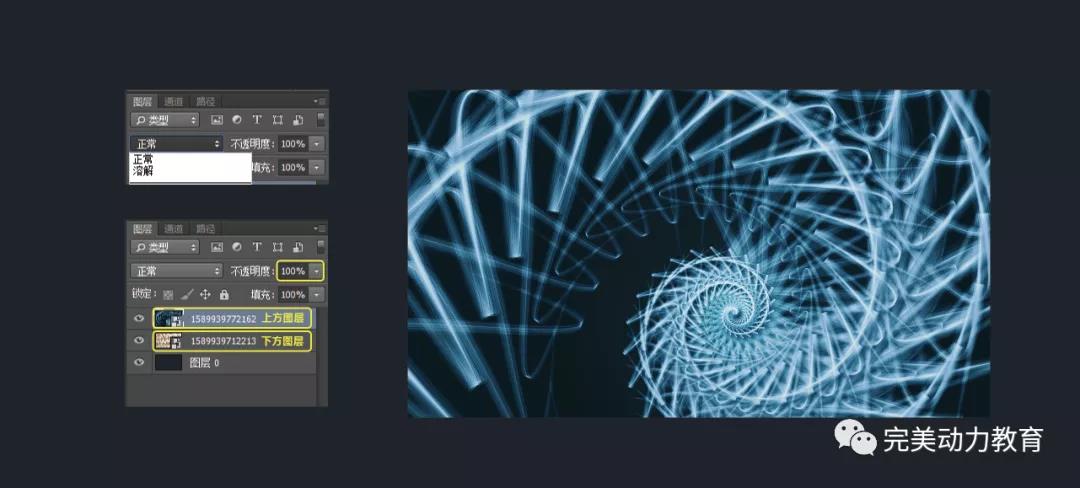 其中,在正?;旌夏J较拢?dāng)不透明度在100%的時候(也就是完全不透明),上方圖層將完全遮住下方圖層。隨著上方圖層不透明度的降低,上方圖層也就會一點點變透明,當(dāng)上方圖層不透明度為0%時,我們就看不到上方圖層了。