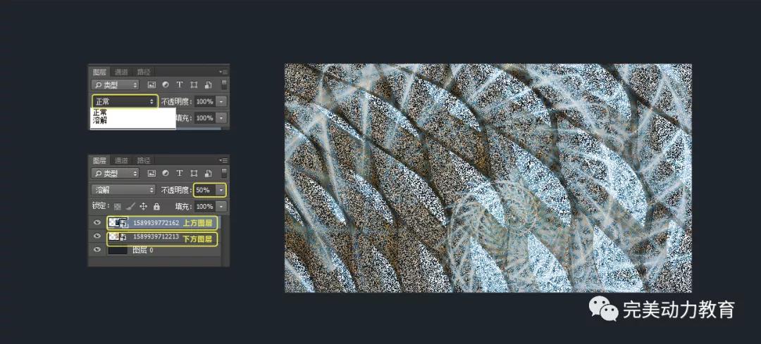 在覆蓋層除了正?;旌夏J竭€有一個溶解混合模式,在正?;旌夏J较陆档筒煌该鞫犬嬅婢蜁鶆虻淖兺该鳎芙饣旌夏J骄蜁嬅孀兂深w粒狀。隨著不透明度的降低,顆粒散開的程度也就越大,當(dāng)不透明度為0%的時候就完全看不到了。