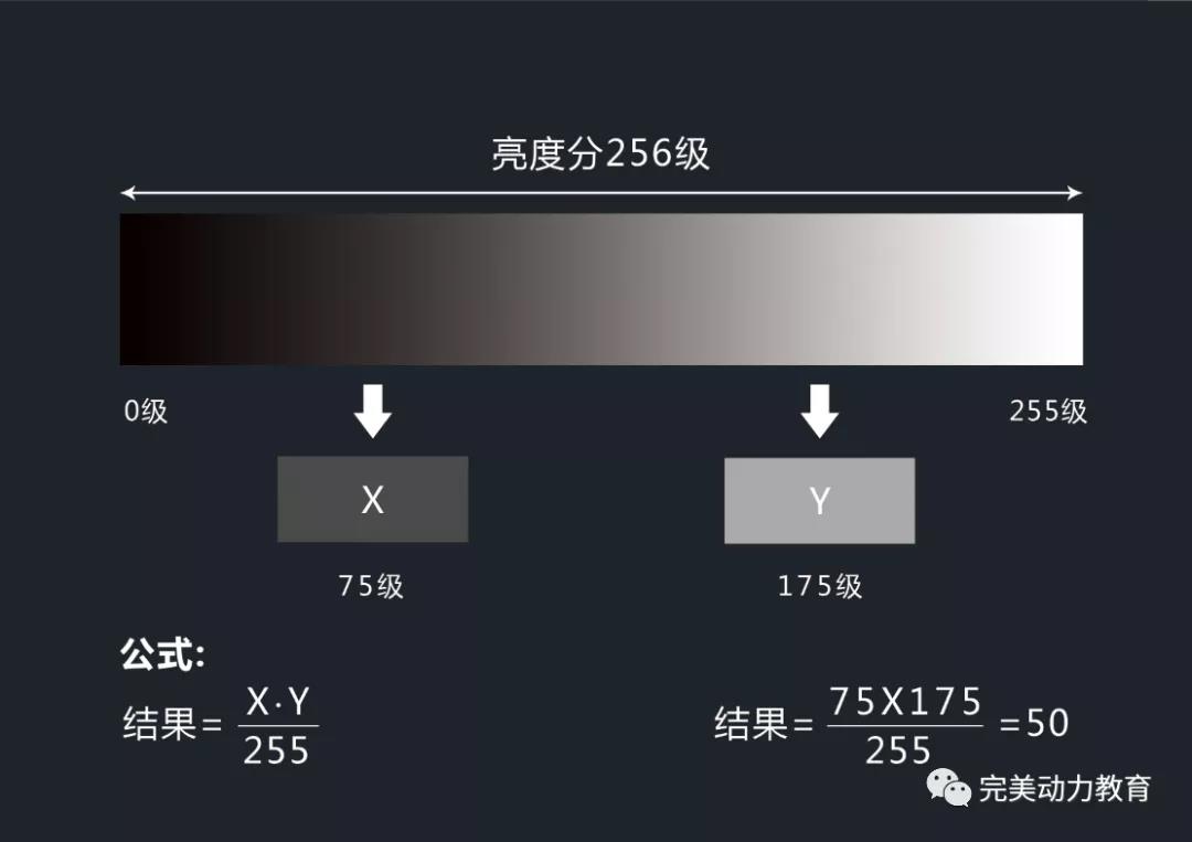 正片疊底混合模式,我們知道亮度大約可以分為256級,0級最暗,255級最亮。正片疊底的原理就是將兩張照片的亮底數(shù)值相乘再除以255。