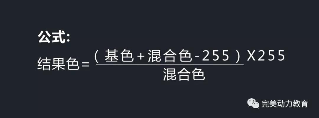 我們大概可以這么理解:顏色暗的會變得超級暗,甚至是直接變黑,而且原來亮的地方依然很亮。顏色加深的混合模式就是下圖中的一串公式。