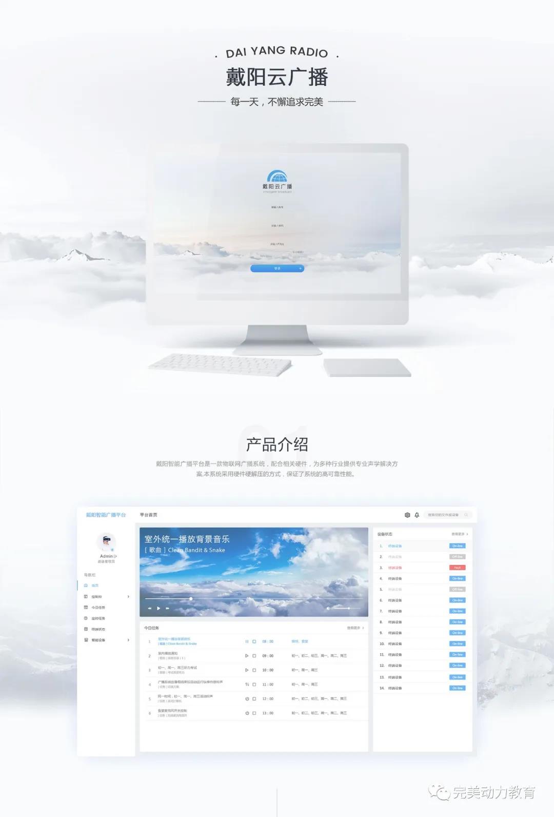 后來陳賢瑞又參與了戴陽智能廣播平臺制作項目,參與團(tuán)隊前期溝通,根據(jù)客戶需求幫助團(tuán)隊梳理交互流程,模擬場景人物畫像,完成系統(tǒng)的交互設(shè)計稿;負(fù)責(zé)整個項目的UI風(fēng)格整體規(guī)劃設(shè)計,產(chǎn)品UI的迭代,規(guī)范化以及常規(guī)維護(hù),讓自己又提升了一個臺階。