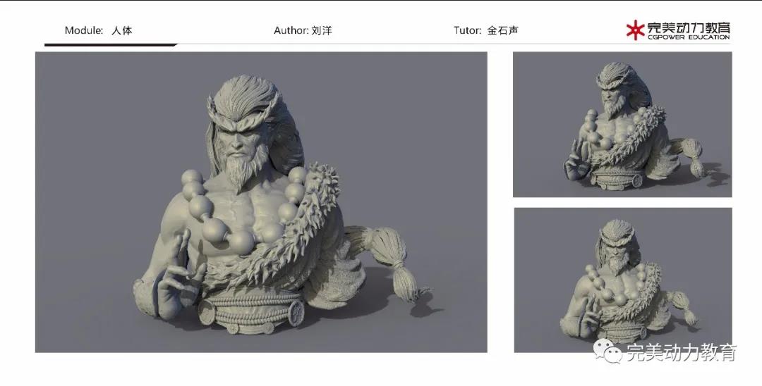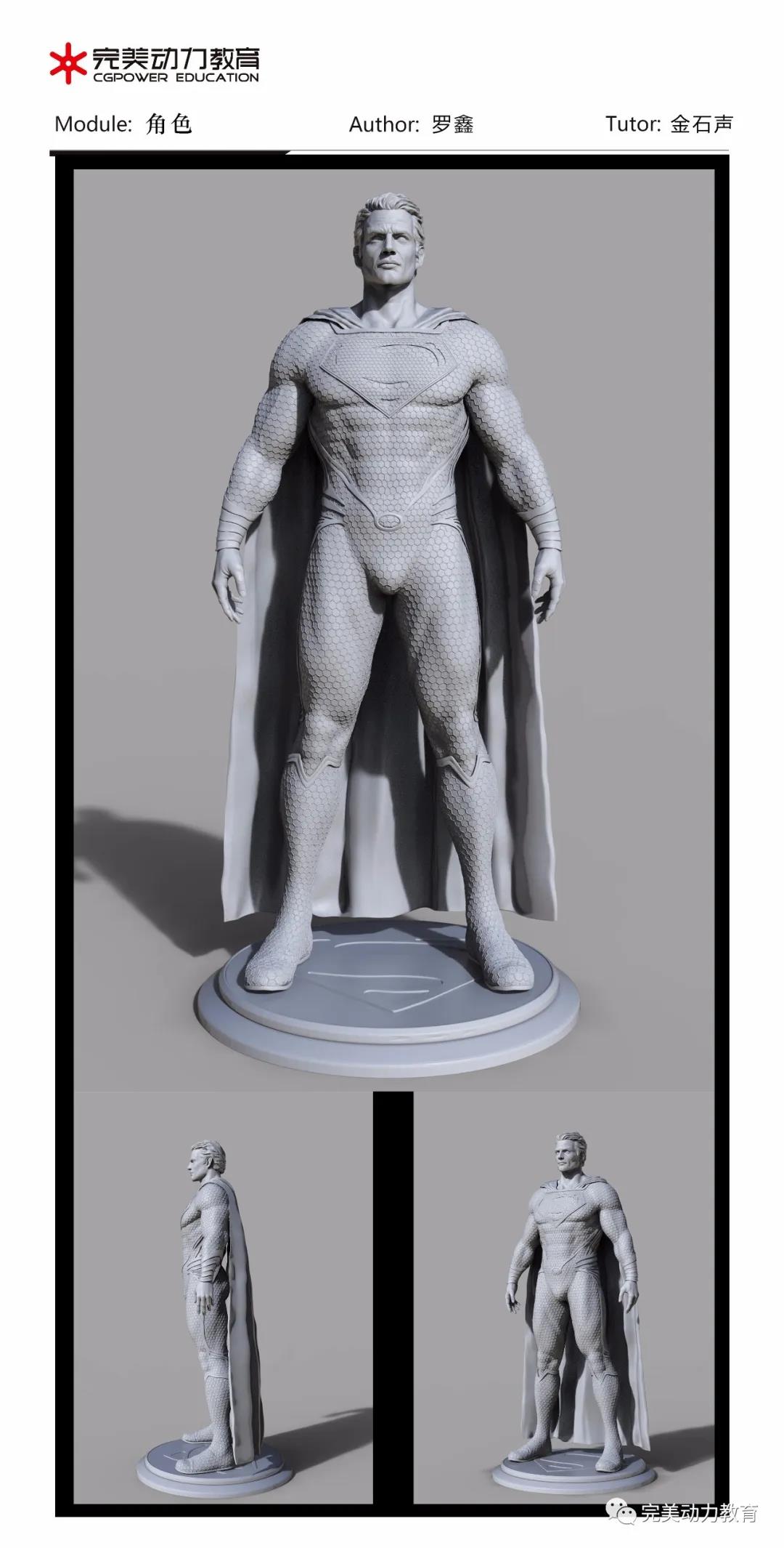 學員作品評價:該作品的參考來源于影視截圖。該生可以說比較完整的完成了超人這個影視角色的亮點。標準的完整男性人體詮釋的非常完整。力度感十足,整體硬朗決絕。人物面部刻畫也比較細致,各個結構都比較接近原圖。裝備處理就稍顯不足了。蜂窩生化服處理的較完整,其他裝備的結構銜接不是很嚴謹。手腕的褶皺雕刻