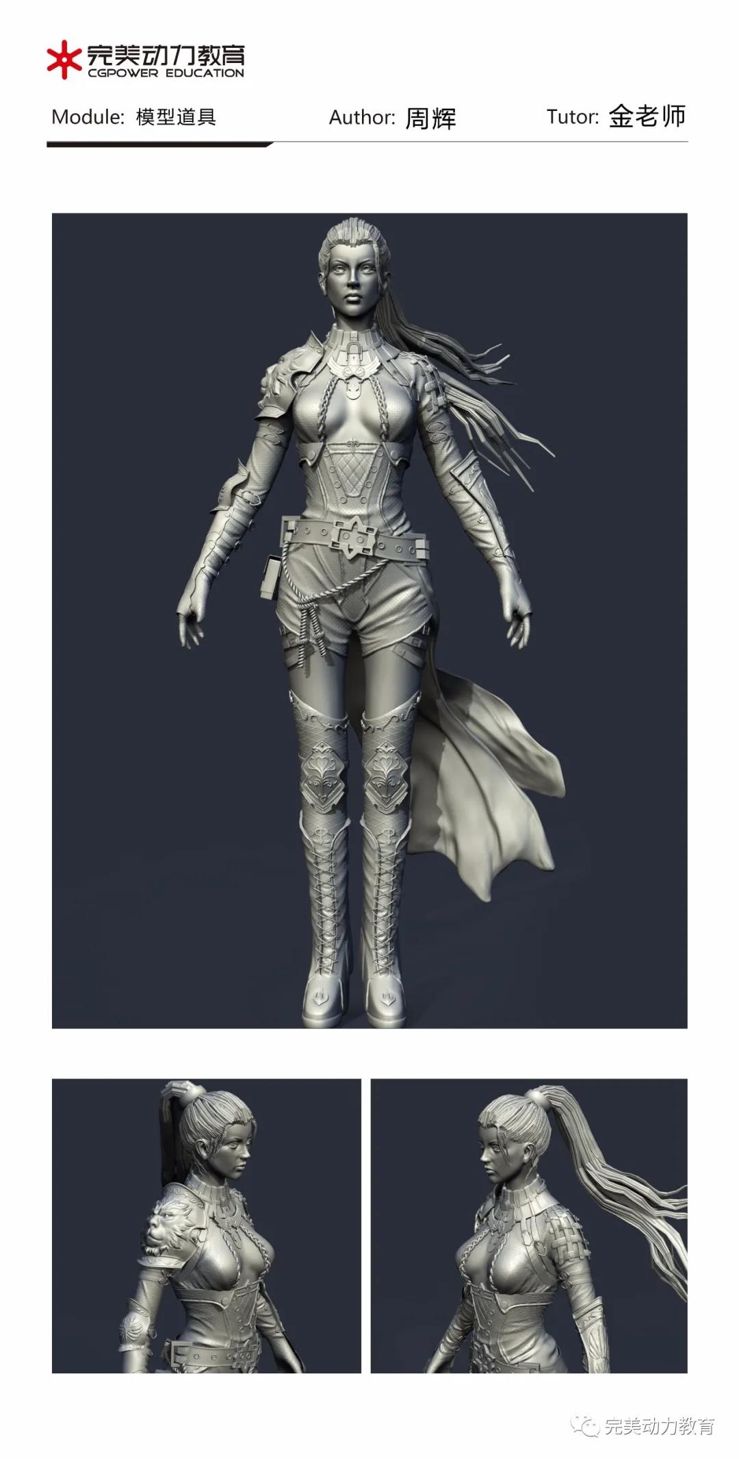 學員作品評價:該生自己找的參考類似于游戲次時代。該作品的完整度很高,整體緊身裝備銜接合理,細節(jié)豐富多彩。比如肩甲的獅子頭,和胸部的腰帶勒緊褶皺,最重要的一點是復雜的裝備并沒有影響身體結構的體現。女性的身體的柔美體現的還是非常不錯的。女性面部刻畫也比較有味道,沒有處理成很柔弱的感覺,而是在硬朗方面做了點文章。比較符合角色的職業(yè)設定。