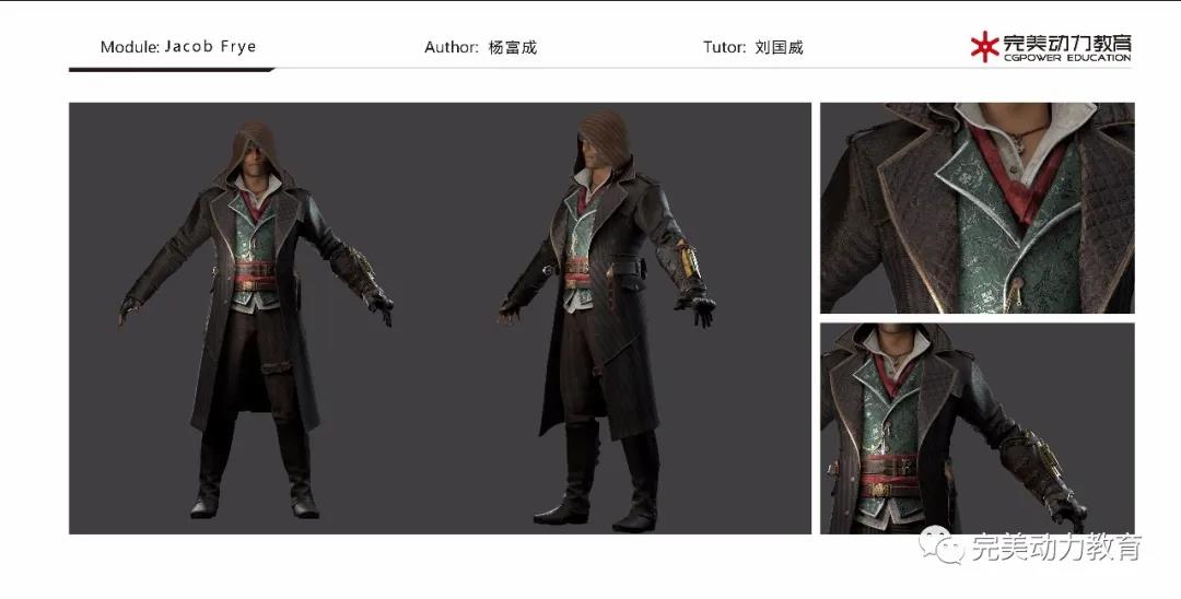 學員作品評價:這幅作品是刺客信條里的概念設計角色,在七天的時間里制作出來難度比較大。學員制作過程中,基本按照原設計作為參考的。整體風格把握準確。角色臉部細節(jié)稍顯不足但是不影響整體效果。服飾的質感細節(jié)制作的很精細,皮革、金屬、布料、材質表現清晰。各種質感的粗糙度、 高光狀態(tài)、表現準確。再從紋理層面來說,紋理素材應用合理。色調控制統(tǒng)一。白色襯衣的表現稍微有點弱。質感上沒有做的那么透。