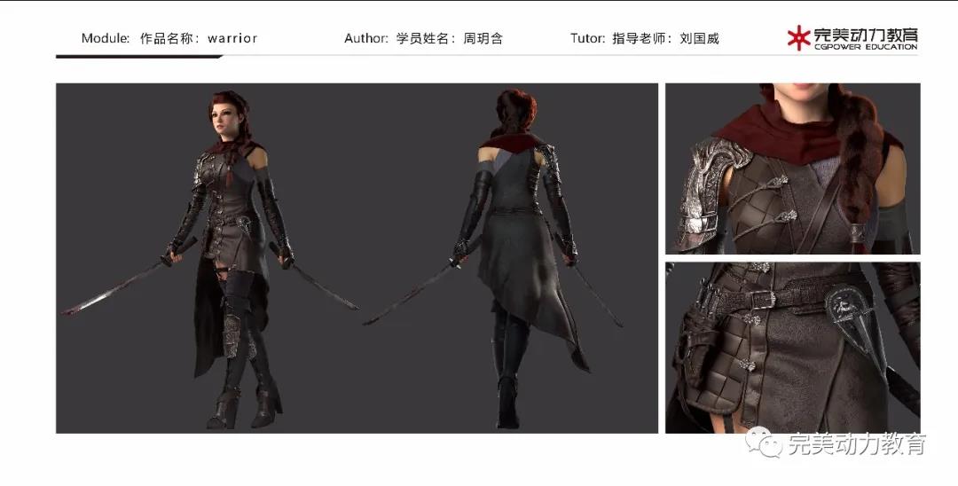 從制作上來說這幅作品體現出細致的作者心態(tài),皮膚貼圖以及服飾細節(jié)都很精細,毛發(fā)辮子的制作格外考驗了學員在制作上的細致程度和耐心。肩甲的制作以及細節(jié)的制作很精細。技術應用上也是合理的。光影處理上也是為了展示紋理并沒有做過多的渲染。整個作品是很優(yōu)秀的作品也不為過。本學員能夠積極地表現出所學知識點,并且在第一幅作品中就能很好的表現出優(yōu)秀的制作能力。給贊!