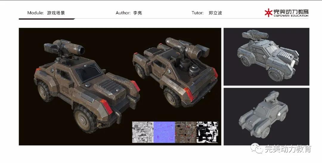 本幅作品作者的參考了一輛戰(zhàn)車,主要以金屬材質為主,整體的造型較準,布線合理,最終作品表現的效果較好,材質質感層次明確,色彩豐富,整體色調協(xié)調,在細節(jié)塑造上從汽車的磨損到輪胎的細節(jié)都表現較較好,基本完整的塑造了模型到材質的整體效果與細節(jié)表現,達到了本階段學習的效果。繼續(xù)加油!