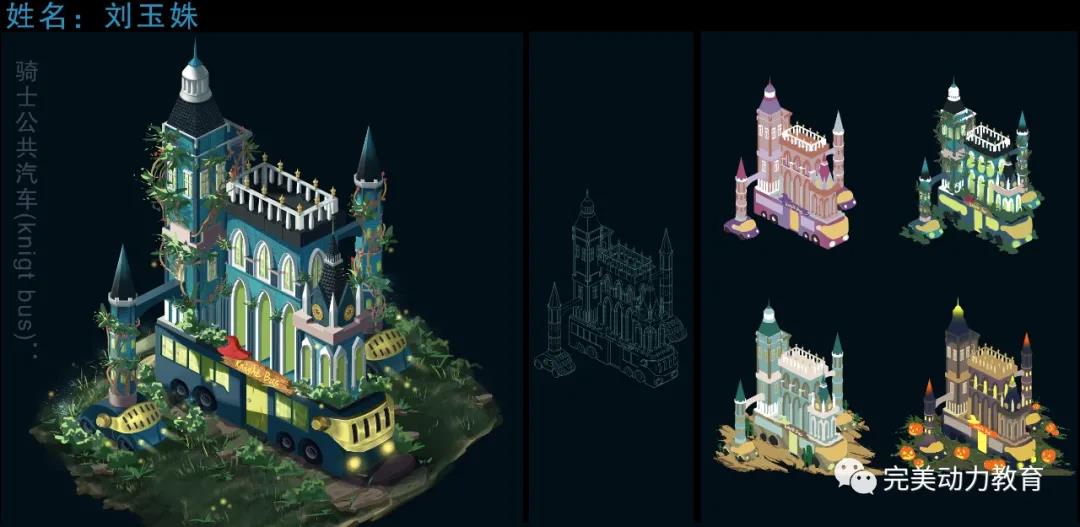劉玉姝:那應(yīng)該就是“騎士公共汽車”了,當(dāng)時(shí)老師給的題材是《哈利波特》,我都沒(méi)看過(guò),為了把作品做好,我還專門(mén)花了兩天時(shí)間惡補(bǔ)這部電影??赐觌娪爸?,就決定做那個(gè)“騎士公共汽車”,因?yàn)榍捌谑煜ぷ髌坊撕荛L(zhǎng)時(shí)間,別人都在細(xì)化了,我還在設(shè)計(jì),內(nèi)心比較著急。越著急越容易出錯(cuò),改了幾次,思路都亂了,最后還是在老師的指導(dǎo)下,順利完成這部作品。