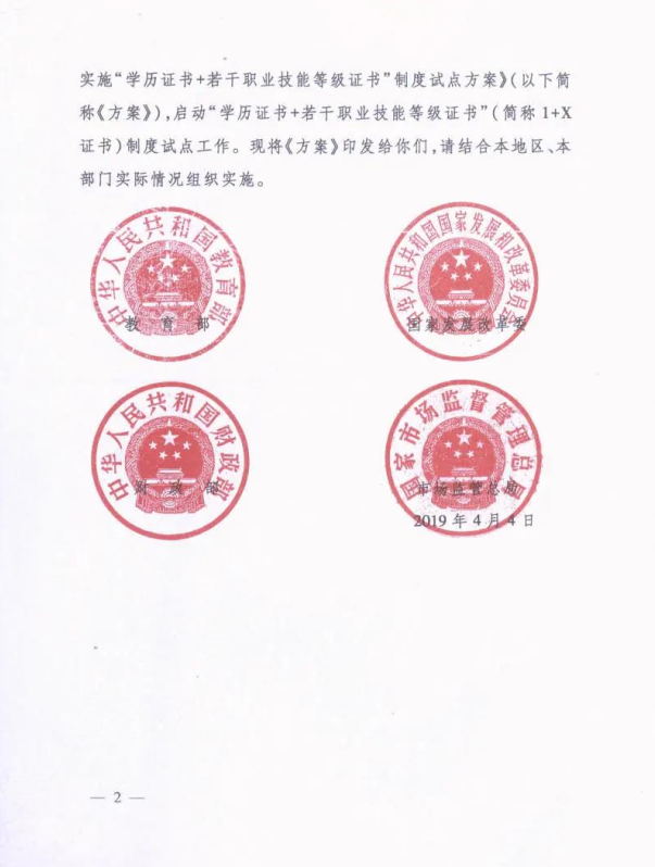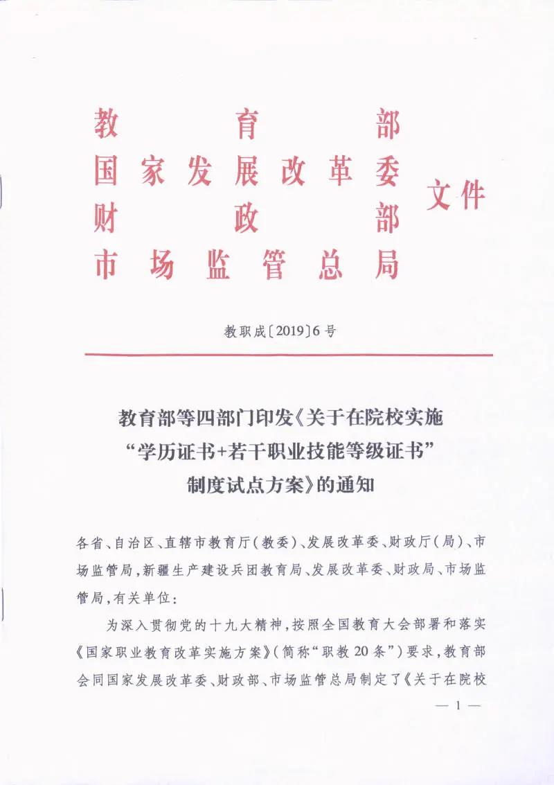 2019年教育部、國(guó)家發(fā)展改革委、財(cái)政部、市場(chǎng)監(jiān)督總局聯(lián)合印發(fā)了《關(guān)于在院校實(shí)施“學(xué)歷證書(shū)+若干職業(yè)技能等級(jí)證書(shū)”制度試點(diǎn)方案》。